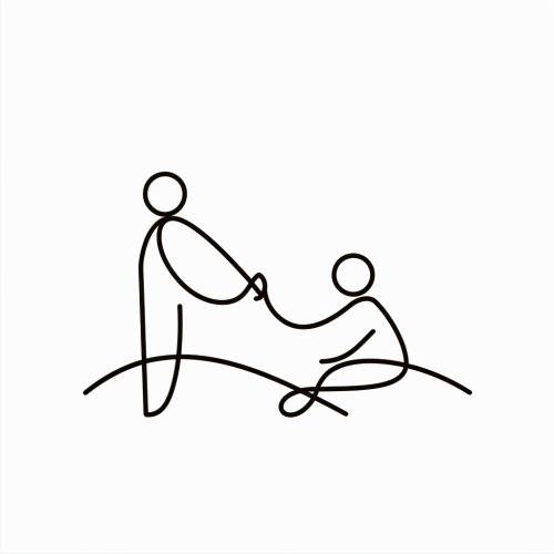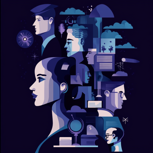 flat vector illustration using stick figure pictograms to show humans being cloned at a factory and making their way up a set of stairs and walking towards a light, the color palette should be dark shades of blue and purple, keep it simple and clean