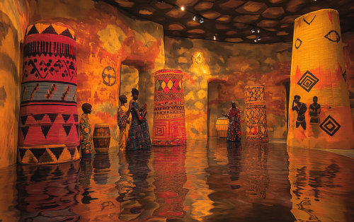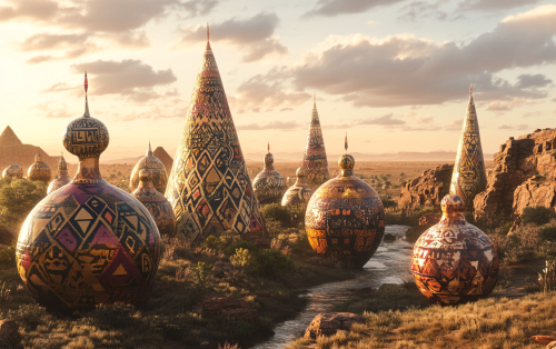 "An immersive African landscape featuring monumental inflatable structures symbolizing the civilizations of Nubia, Axum, and Ashanti, each adorned with traditional patterns and vibrant colors. The Nile River flows like a lifeline through the scene, connecting each structure. Background colors are warm and earthy, with sunset hues. Imagery of musicians with drums and spoken-word symbols enhance a cultural, Pan-African ambiance, showcasing Africa’s historical and cultural unity --ar 8:5
