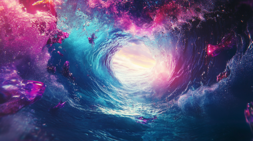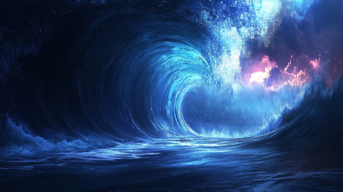 design a realistic scene of underwater scene of the inside of an ocean wave crashing from eye level with water, with striking lighting and lots of blue oceanic colors --ar 16:9