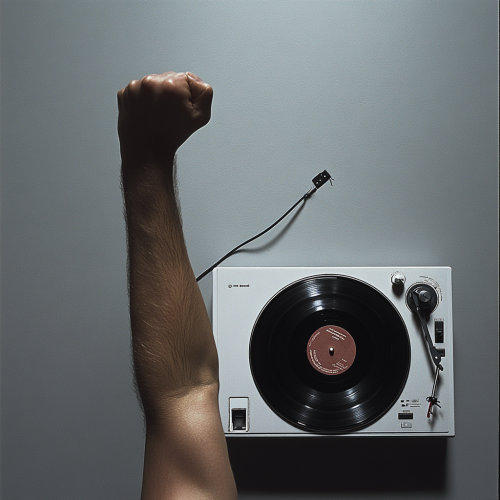 A photo from above shows an arm and fist raised towards the camera. The hand is holding a turntable needle that has come off the record player and is flying across the screen in front of an all-gray background. The hand is also holding onto one end of a cable that is playing music