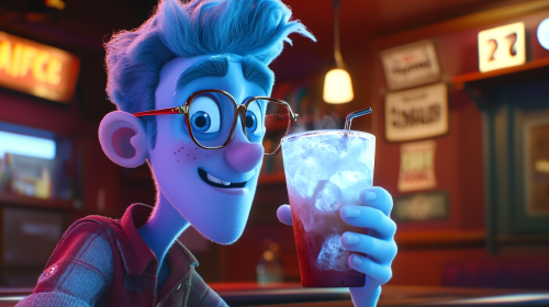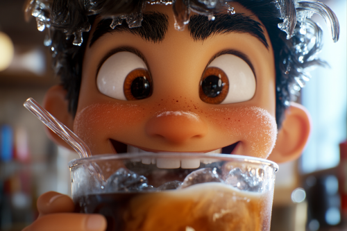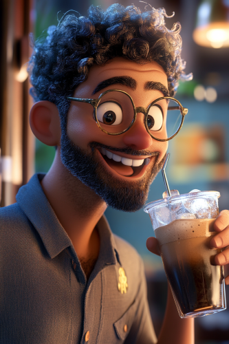 In a Pixar-inspired 3D animation, a man drinks iced Americano through a straw from a clear cup, his eyebrows frosted over from the cold but his expression beaming with happiness. The ice cubes and coffee are vividly rendered in the cup, bringing a refreshing detail to the scene. Virtual setup: Nikon D850, f/5, ISO 200, shutter speed 1/100 sec for sharp detail. --ar 2:3 --v 6.1