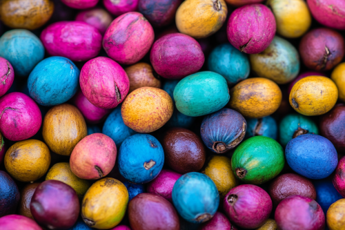 a close up photo of some coffee beans, in the lot you have some of the coffe beans that are painted with bright colors, pink, blue, green, yellow, gold and some are natural colors, ultra HD --ar 3:2