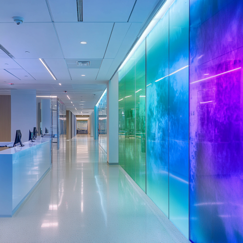 a glass wall with blue and green walls, in the style of medical themes, contemporary candy-coated, white and violet, kodak vision3, highly polished surfaces, light white and blue, interactive media