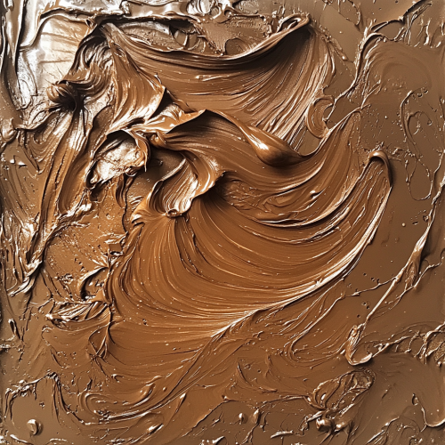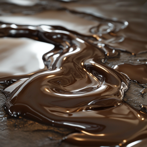 Melted chocolate spreading across the ground with a gentle flow, creating soft ripples on the surface. The rich, glossy chocolate forms a smooth, liquid texture, with small waves and delicate patterns spreading outward. The scene is indulgent and visually captivating, focusing on the luscious, flowing movement of the chocolate as it spreads and creates a mesmerizing ripple effect