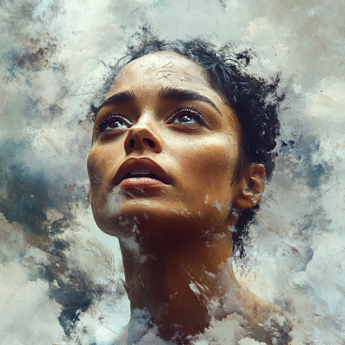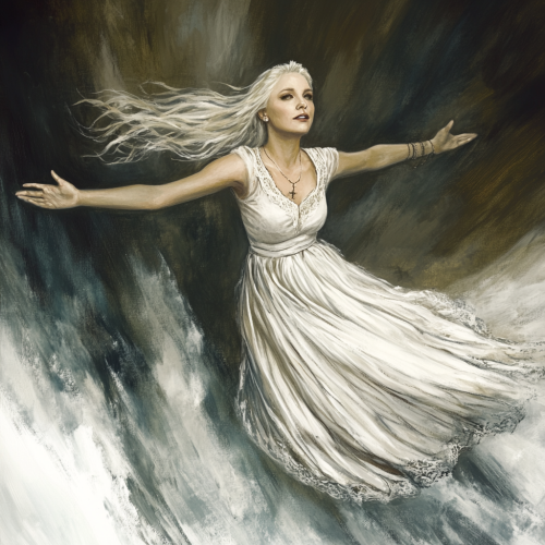 A full body illustration of a woman, A highly stylized white oil painting with texture of paint that adds depth and movement to the dramatic setting, with primary palette colours of White, light gray-white and Aqua, captured with dramatic brushstrokes, dramatic white brushstrokes to create depthand dimension with dramatic, cinematic effect. White light effects with moody storm clouds. --chaos 60 --v 6.1 --stylize 400 --weird 300 --personalize ylov71j