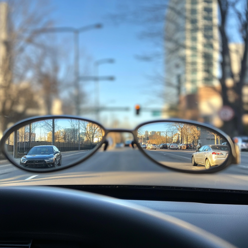 a picture from inside a car wit the view from an eyeglass reduces the effects of glare, adds more brilliance and sharpens contrast.,versus normal view