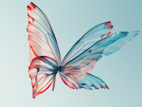Minimalistic transparent wings floating in a light blue sky, with red and blue accents, modern and dreamy, ethereal and airy, soft lighting, no food elements, sense of freedom and elegance --ar 4:3 --v 6.0