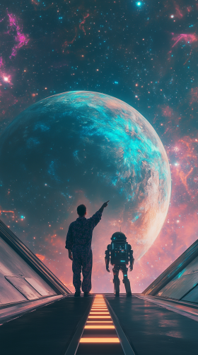 a phone wallpaper with a deep space background inspired from The Hitchhiker's Guide To The Galaxy, the space is colours of teal and pink nebula, there is a large planet in the background, on foreground is a man in pajamas pointing up to the sky, along side the man is Marvin the android robot, they both are standing on a ramp leading into the space, they are both looking up into the stars, the ramp is lit with warm yellow runway lights, 3D render --ar 9:16