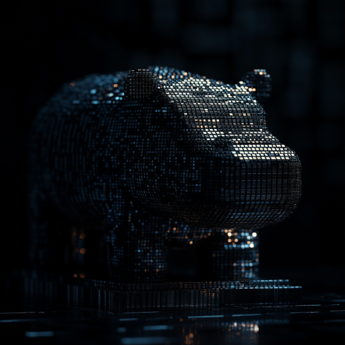 extreme close-up of a single metallic 8-bit. hippo on a sleek pedestal, softly lit by a the smallest sliver of light highlighting the metallic texture in a very dark room. Futuristic, minimalist Apple-inspired design, 1980s retro futurism, monochromatic, high contrast, subtle reflections, dramatic shadows with a mysterious, cinematic look, so viewers can't immediately tell what the object is