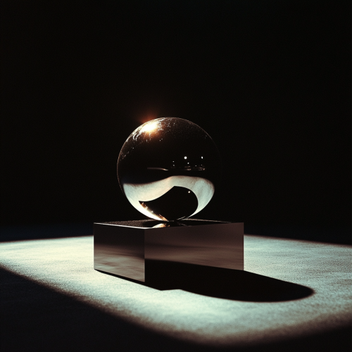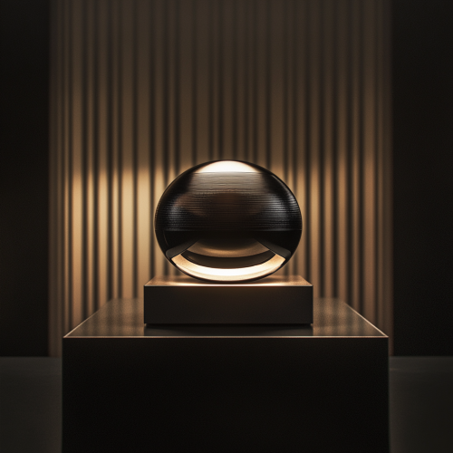 close-up of a single metallic object on a sleek pedestal, softly lit by a sliver of light highlighting the metallic texture in a dark room. Futuristic, minimalist Apple-inspired design, 1980s retrofuturism, monochromatic, high contrast, subtle reflections, dramatic shadows with a mysterious, cinematic look, so viewers can't immediately tell what the object is