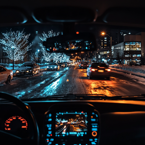 a night view fro the inside of a car with the view from an eyeglass reduces the effects of glare, adds more brilliance and sharpens contrast.,versus normal view