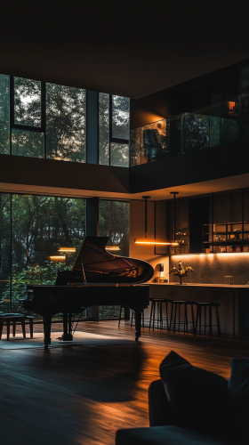 a grand piano with a spotlight on it in a dark modern room at night, shot with a fujifilm GFX100 II, keep framing in mind to be used for an iphone wallpaper, photorealistic --ar 9:16