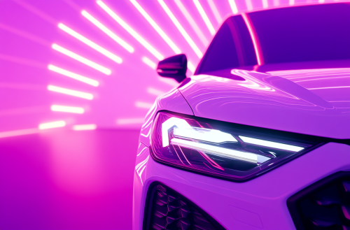 Cinematic photograph of the 2020 Audi A1, white body color with black details, parked in front of an abstract background with purple gradient colors, low saturation, featuring modern design elements and illuminated headlights. The backdrop is a gradient from purple to pink. The overall composition captures motion blur and dynamic lighting, enhancing visual appeal. --ar 35:23