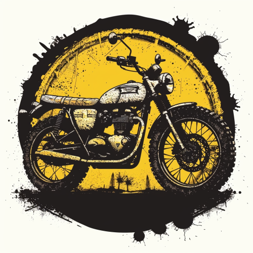 circular logo, vector, motorcycle triumph scrambler in dirty road in the background yellow, black gradient background, italian old style, retro graphic design, stilized --v 6.0