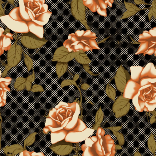 A houndstooth pattern with Chanel roses in the style of Coquette, vintage-inspired designs, dark beige and black, bold yet graceful, vintage poster art, flat illustrations, black background, flat illustration. . --tile --v 5.1 --c 10 --iw 0.5