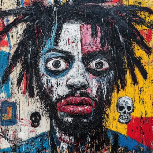a wabi sabi painting as if Jean Micheal Basquiat made it, represents travel and thinking of the future, street art, realistic paint strokes ar 48:48 --s 250