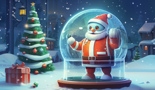 in a lively, colorful festive holiday scene, show an AI robot in a snow globe being shakened up --ar 31:18