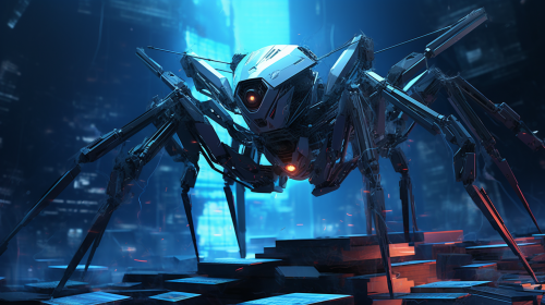 A concept art of an AI-powered spider robot crawling through a web made of financial data streams and documents, digital art --ar 16:9