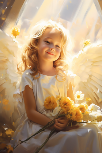 oil painting, beautiful bright flowers around, Pray with both hands. a cute young girl baby 7 yo angel is smiling in front of angel wings, divine light from above, in the style of 32k uhd, cute and dreamy, , divine Light, blender 3d, Michelangelo's, photorealistic details --ar 10:15