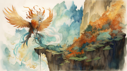 Amidst the vibrant world of Avatar: The Last Airbender, a human and harpy spirit fusion stands on a cliff edge, feathers seamlessly blending with their hair, wings outstretched in majestic glory. The surroundings echo the elemental balance, with air, water, and earth converging, Illustration, watercolor painting, --ar 16:9 --v 5.0