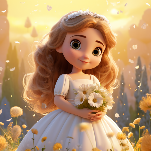 baby girl, light brown midlong hair, brown eyes, in baptism white dress, golden hair band, surrounded by flowers, in the style of 8k 3d, concept art by Pixar, light amber and blue sky, fine feather details, subtle use of shading