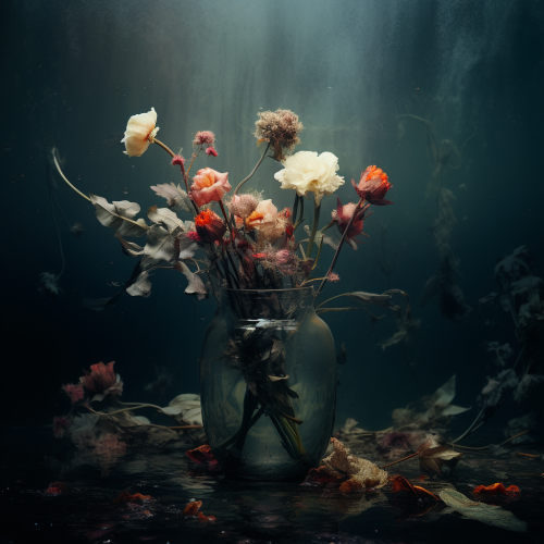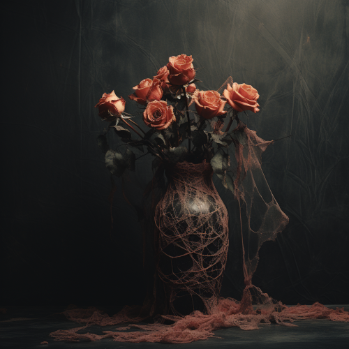 a vase of roses covered in cobwebs. Dark colour palette. High definition 8k resolution