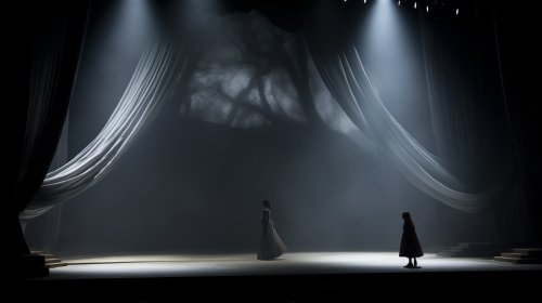 Dark stage with giant tulle screen lit in front of LED projection without people, --ar 16:9