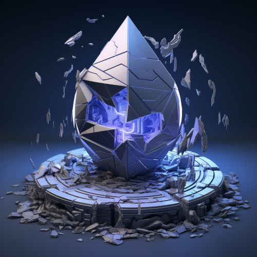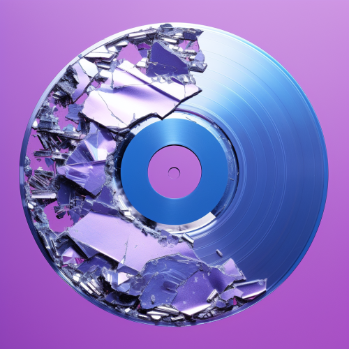 a cd that gets destroyed in a few pieces, a simple one colored purple background, the disc is suppose to be silver with light blue and purple elements, make the picture simple and not to dramataric