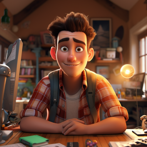 a 3D disney animated version of a guy that works as a graphic designer freelance, 8k, detailed, 3d.