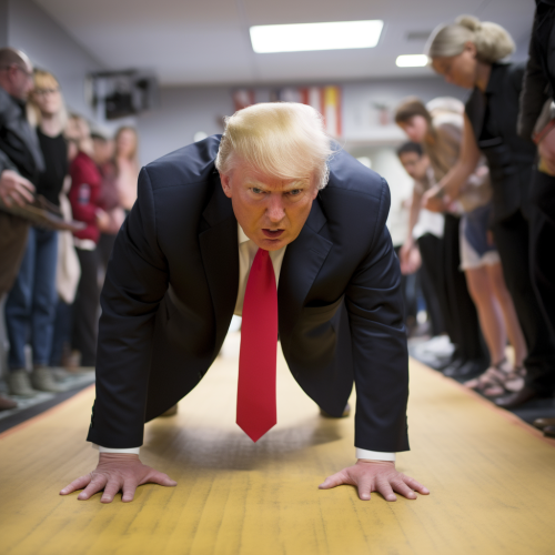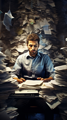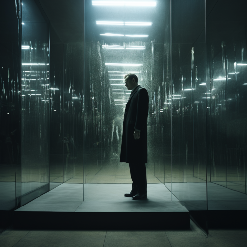 A man in a black suit looks through a gigantic mirror. In transparency of the glass, interject this image for me: