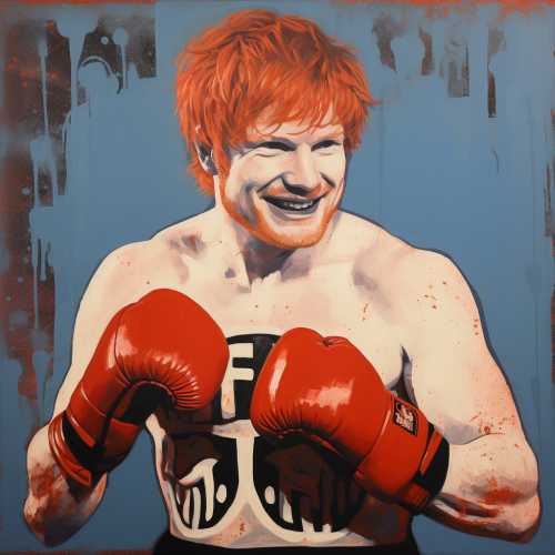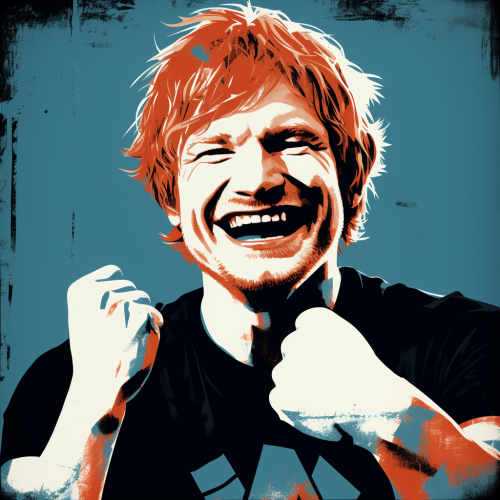 ed sheeran smiling as a boxer, Steven Heller style, inspired by the bold graphics of Soviet Socialist Realism, high-contrast stencil technique, white plain trashed background.