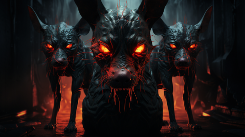 evil dog with two heads , creepy, devilish , dark ,stainless steal environment , abstract projection , octanerender , --ar 16:9