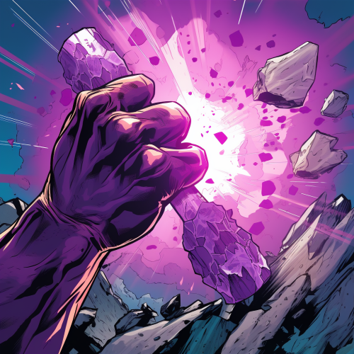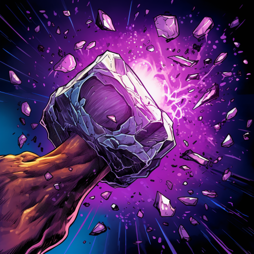 comic book art of a hammer shaped like a fist made of amethyst, smashing though purple glass with shards flying everywhere, profile picture, line drawing with shading and vibrant colors