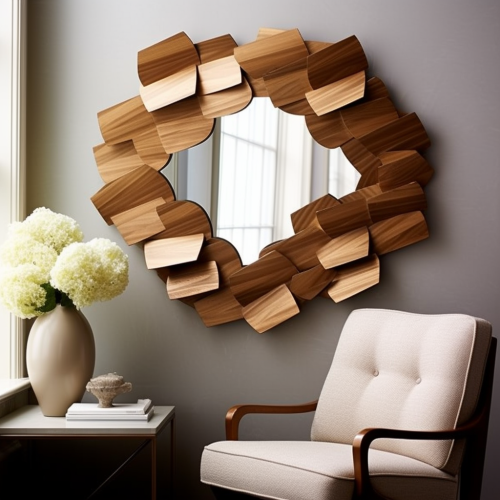 Layered Wooden Mirror: Design a layered wooden mirror with overlapping geometric shapes. The layering adds depth, creating a visually intriguing piece for walls.