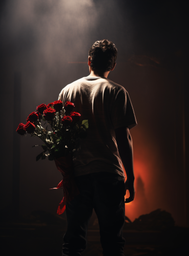 back view of a lean guy standing and looking up with flower bouquet in his right hand, sad, camera low angle, camera tilted up, high contrast, slightly silhoutte, light source from the right --ar 11:15