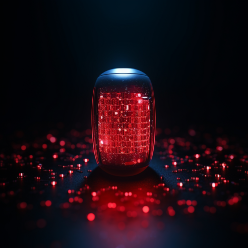 black background, closed-up image of medicine, red neon light, glittery projection mapping on the object HD 8K