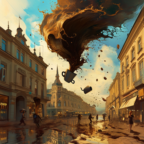 Imagine a whimsical coffee storm in a bustling city. Dark, swirling clouds of rich espresso loom in the sky, releasing torrents of steaming coffee that pour down like rain. The streets are flowing with rivers of coffee, swirling around corners and filling the air with the aroma of freshly brewed beans. Coffee cups, milk jugs, and sugar packets are carried by the winds, spinning through the air like leaves in an autumn breeze. People, carrying oversized umbrellas and wearing waterproof gear, navigate through the coffee-filled streets. Cafes are transformed into islands amidst the coffee flood, with baristas serving drinks directly from the storm. The entire city is engulfed in a caffeine-charged atmosphere, creating a surreal yet invigorating scene. Realstik --v 6.0 --s 50