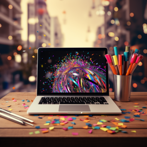 a modern laptop open on a desk, the screen showing a vibrant New Year's greeting message for 2024, with digital confetti and streamers in the background.