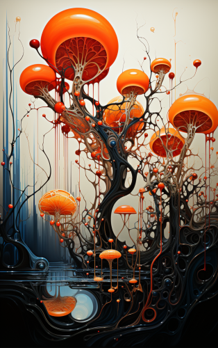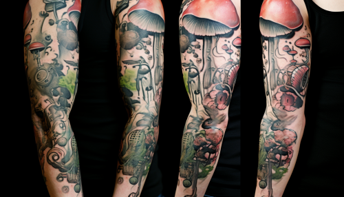 bio mechanical tattoo design trippy, trees, mushrooms,clouds, ufo,futuristic samurai A Nice even mix of biological and Technology blending Nature Technolog and the body, in the style of flcl --ar 7:4