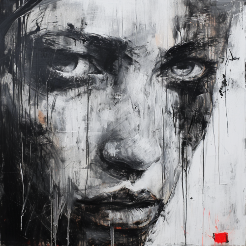An abstract portrait in grayscale with asymmetrical features, one eye detailed and emotional like the essence of a soul peeking through the fog of uncertainty. A fusion of charcoal and acrylic, with visible brush strokes and dripping paint details, capturing a sense of melancholy and depth, signed with a subtle red emblem in the corner. --v 6.0