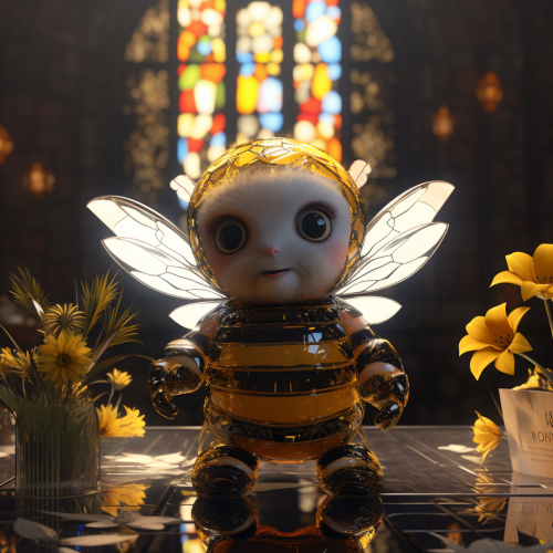 An adorable baby dressed as a bumblebee, with poppy and daisy, logo, in stained glass style, Beautiful brightness, by mucha, UltraHD, dynamic composition, CG render, unreal engine - - ar 2:3 - - v 6