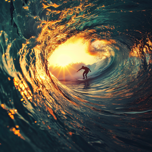 Create an image on a alien surfing in Hawaii pipeline wave in a perfect barrel with the sun showing trough the barrel --v 6.0