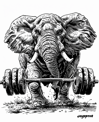 american Style heavy metal tattoo design, an elephant with dumbbells with the text: "jaypro8" --ar 9:11 --v 6.0