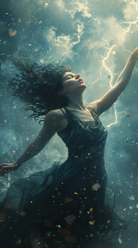 full length image of a beautiful black-haired woman, arms in the air, floating in lightning storm tornado, movie poster style, --ar 9:16 --v 6.0 --s 250