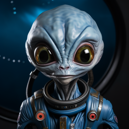 a three foot tall, blue alien with a bald head, bulging eyes, small ears wearing a gray flight suit