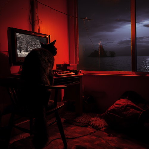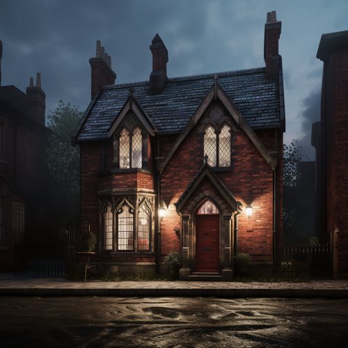 a completely dark small 2-storey brick gothic revival style house, no light coming from the windows, a red door is ajar, the doorway lit by a faint bluish light, the background is dark, hyperrealistic
