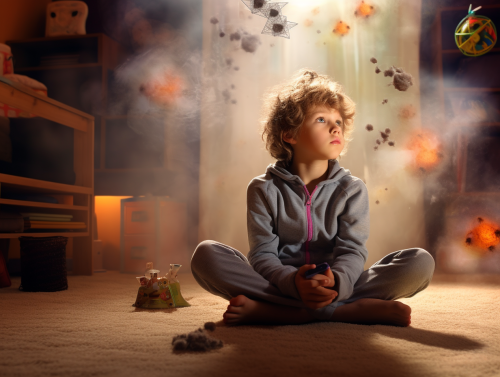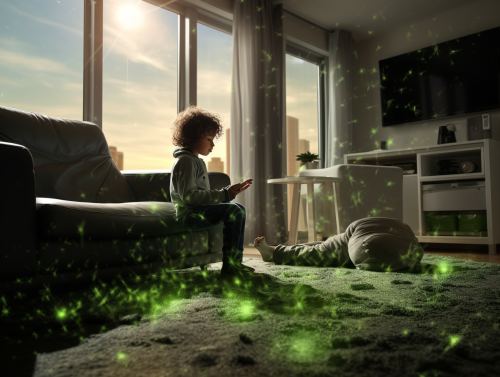 a child is sitting on the carpet in a modern living room, green viruses and dust particles floating in the air. --ar 4:3
