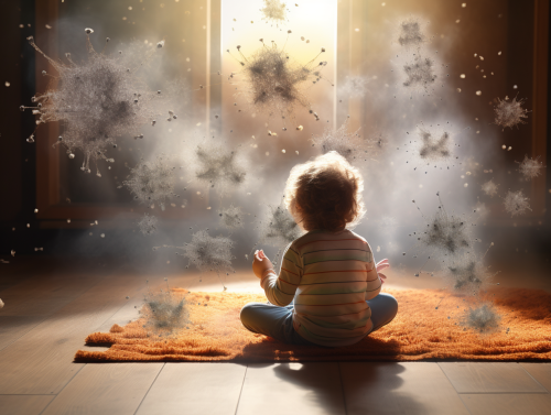 a child is sitting on a clean carpet in a modern living room. viruses and dust particles floating in the air. --ar 4:3