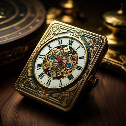 Craft poker cards featuring a clock face as the central motif. Use gold detailing to highlight the clock's intricate hands and numbers, symbolizing the passage of time in each suit