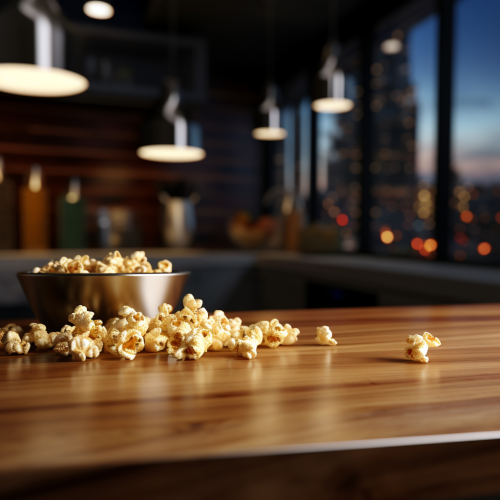 eye level view of a dark wood countertop with pieces of popcorn scattered over the counter. Soft lighting with a blurred background of a television screen. Photo realistic.